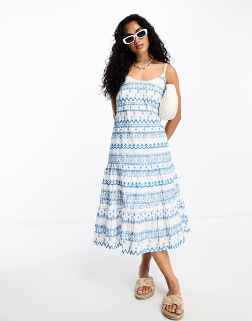 Figleaves Sicily embroidered tiered midi dress in white and blue