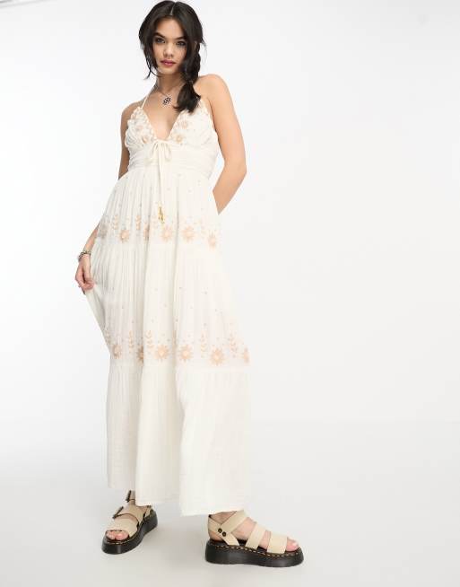 Free People embroidered cotton gauze boho maxi dress in ivory