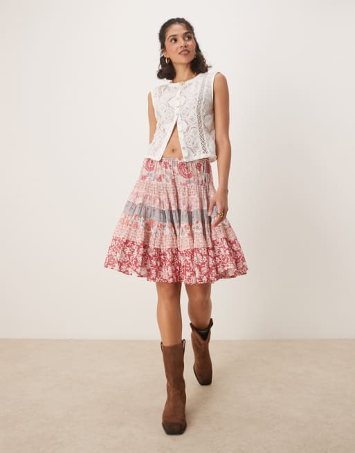 Free People floral print tiered knee length boho skirt in pink