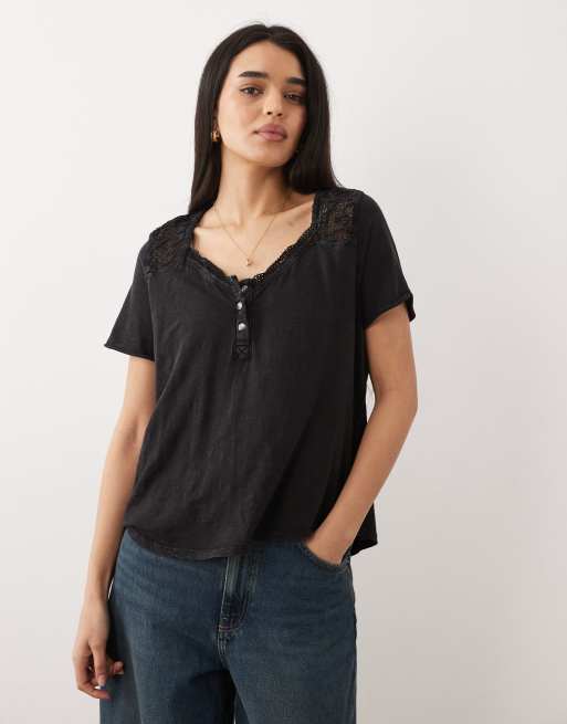 Free People heirloom henley button up tee in black