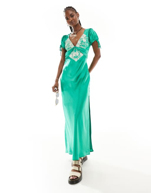 Free People satin midaxi slip dress with tie sleeves in turquoise