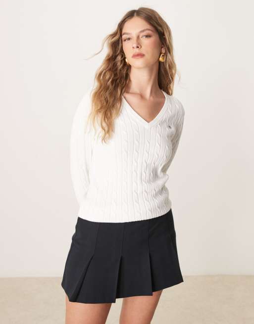 GANT cotton cable knit v-neck jumper with logo in white