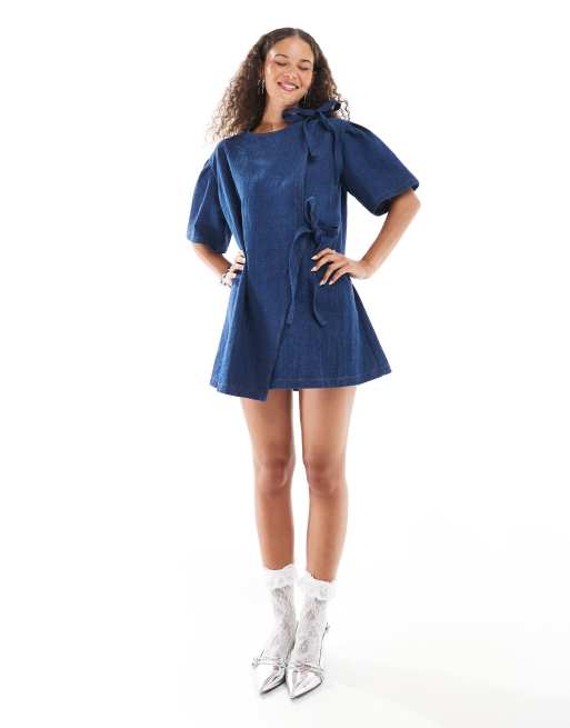 Ghospell bow detail textured mini dress in dark wash denim