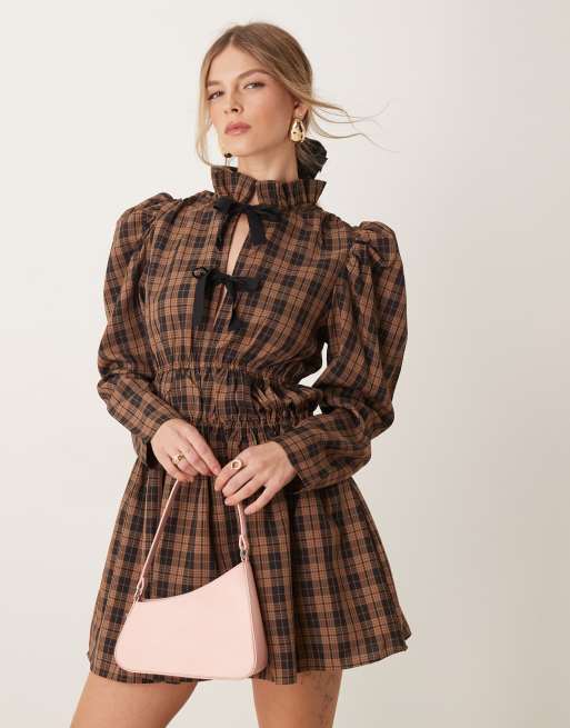 Ghospell check print mini dress in tan and black