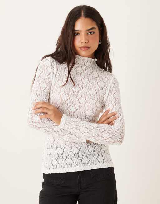 Ghospell high neck lace long sleeve top in white