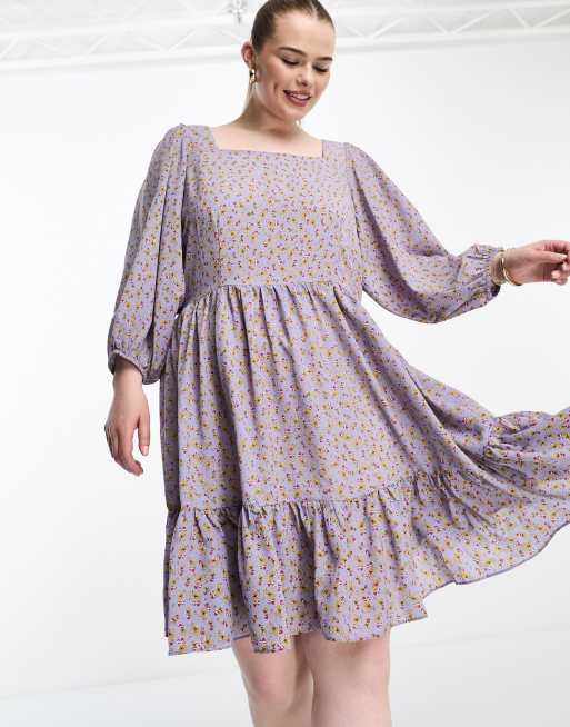 Glamorous Curve square neck tiered smock mini dress in blue strawberry
