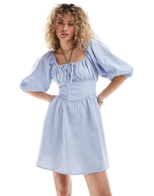Glamorous bow detail corset top mini smock dress in textured blue check