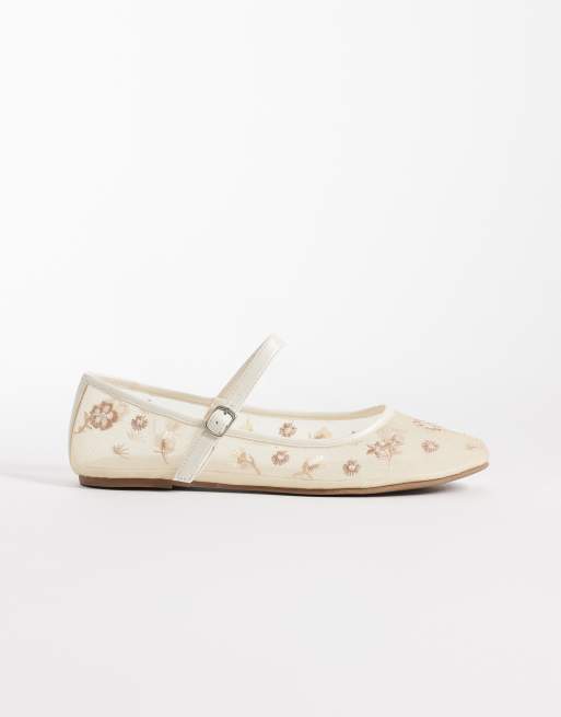 Glamorous embroidered mesh ballet flats in beige