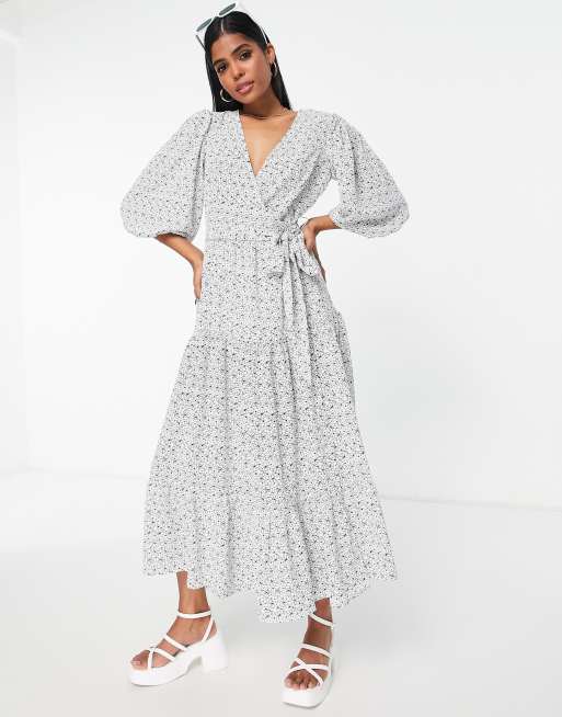 Glamorous long sleeve wrap midi dress in black white daisy