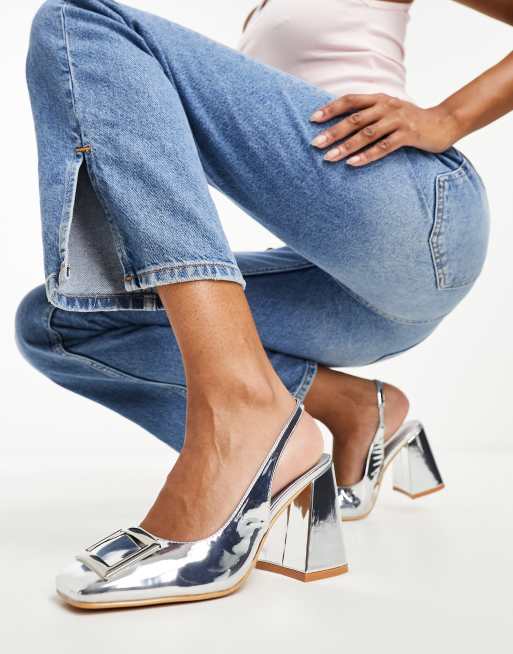 Glamorous slingback block heeled shoes in silver