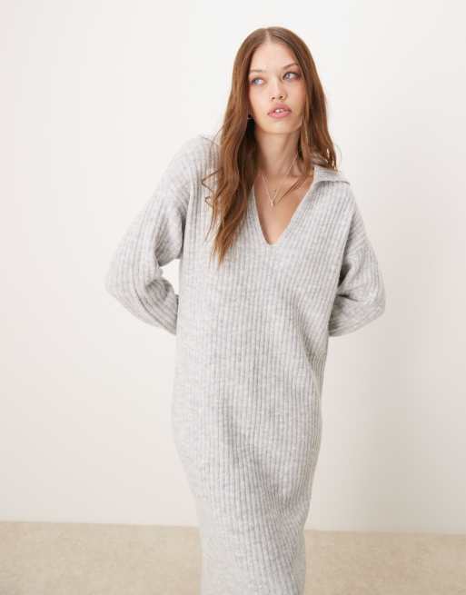 Glamorous v neck collar detail slouchy maxi dress in knitted grey marl