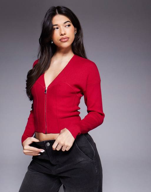 Good American cotton knit v-neck zip front cardigan in ruby red
