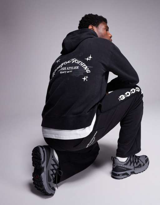 Good For Nothing space dye hoodie with sleeve and back print in black wash (part of a set)
