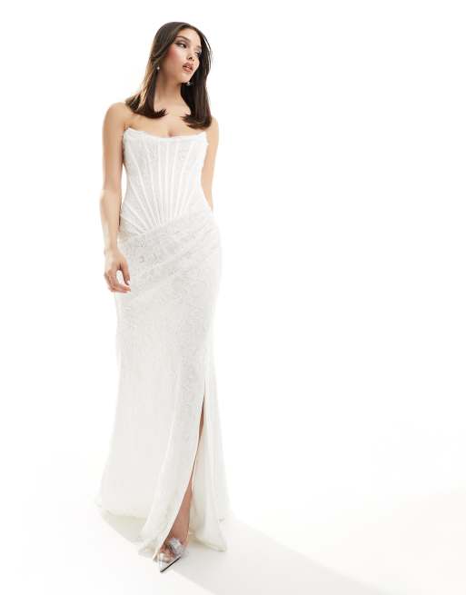 Heiress Beverly Hills premium lace bandeau corset thigh split maxi dress in white