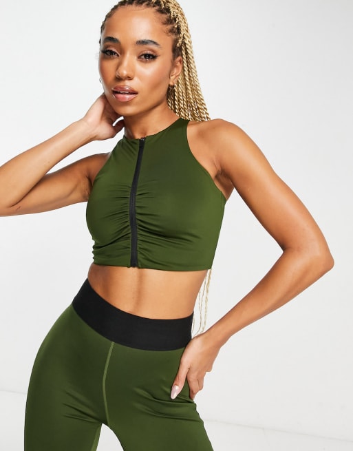 HIIT zip jacket, ruched singlet and ruched leggings set in khaki