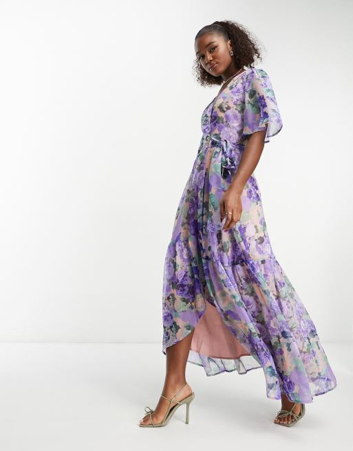 Hope & Ivy flutter sleeve wrap maxi dress in blue floral