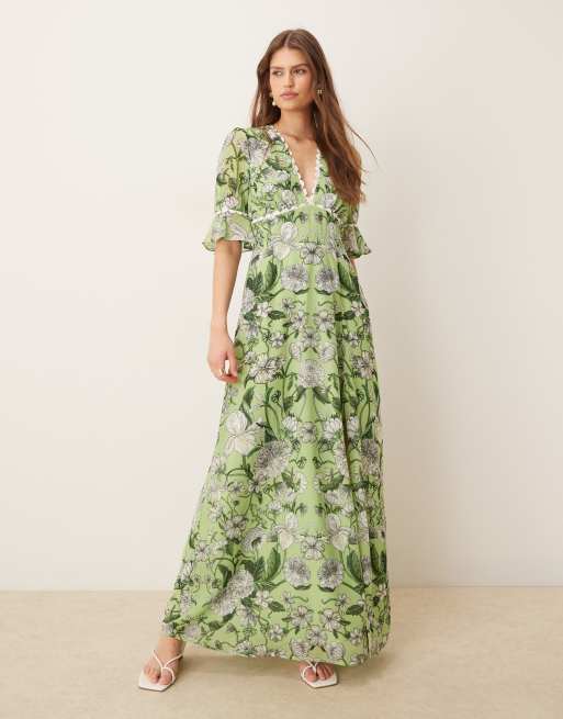 Hope & Ivy frill sleeve thigh split open back maxi dress in green floral