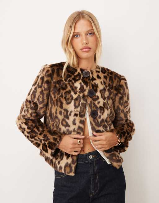 House of Sunny collarless leopard print faux fur jacket