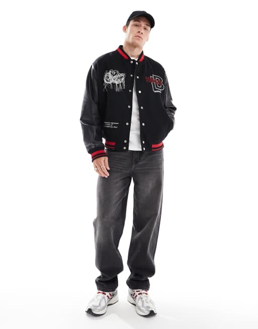 HUGO Red x Les Benjamins varsity bomber jacket in black with leather sleeves and placement embroidery