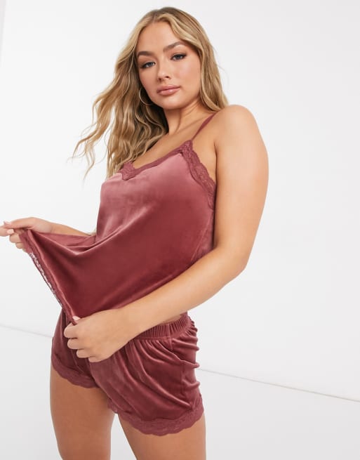Hunkemoller lace trim velour pyjama set in dark pink