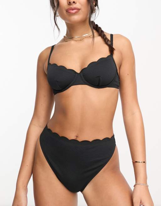 Hunkemoller scallop high leg high waist bikini bottoms in black