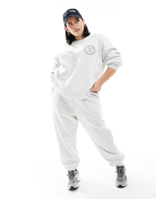 In The Style Plus calm & quiet slogan sweatshirt and cuffed leg trackies in grey marl