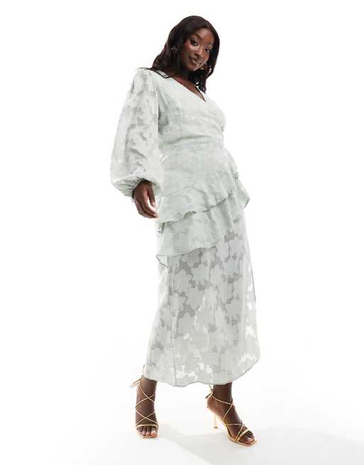 In The Style Plus x Perrie Sian wrap asymmetric ruffle maxi dress in sage jacquard