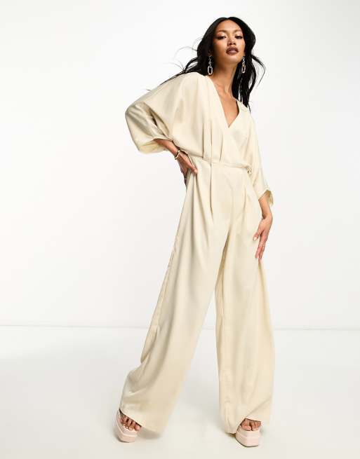 In The Style v neck batwing sleeve wide leg jumpsuit in stone