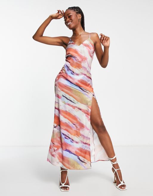 In The Style x Yasmin Devonport exclusive satin plunge front maxi dress in multi abstract print