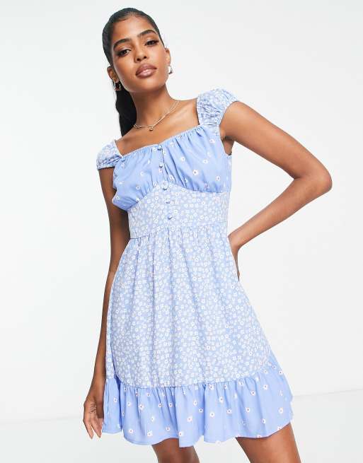 Influence cap sleeve frill detail mini dress in mixed blue floral