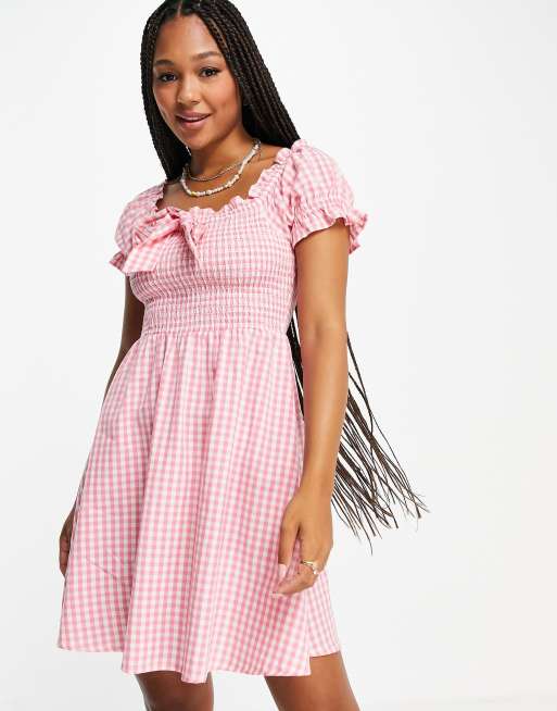 Influence off the shoulder mini dress in pink gingham