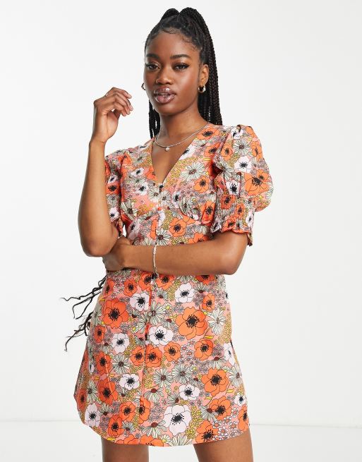 Influence short sleeve button front mini dress in orange floral