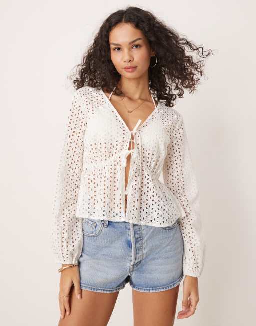 JDY tie front broderie detail top in white