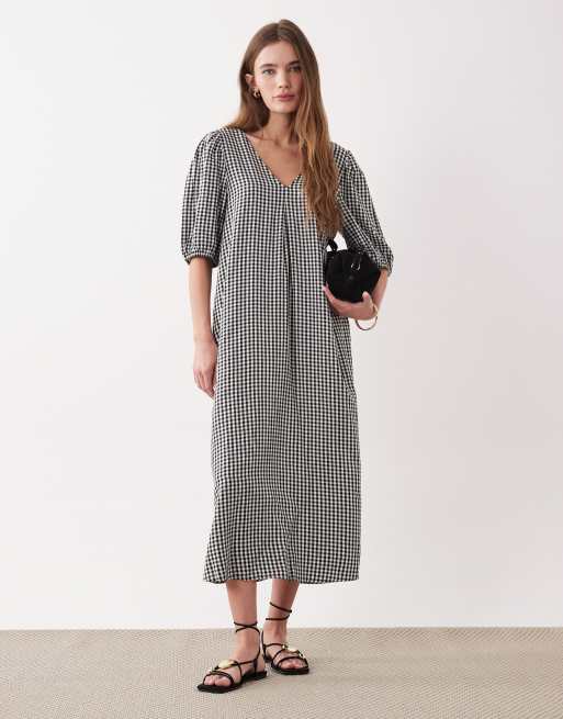 JDY v neck puff sleeve midi dress in black gingham