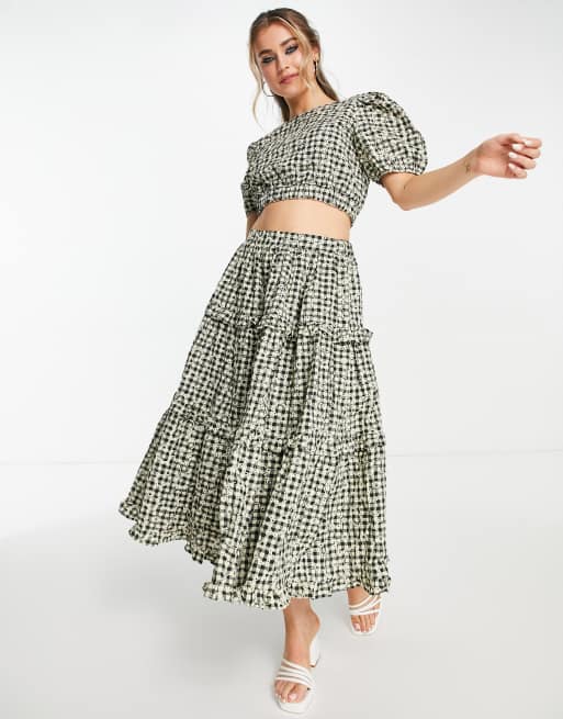 Just Me embroidered tiered midi dress in black gingham