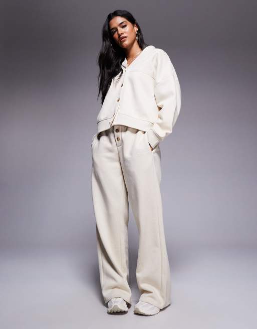 Kaiia cotton blend embroidered logo button detail wide leg trackies in beige (part of a set)
