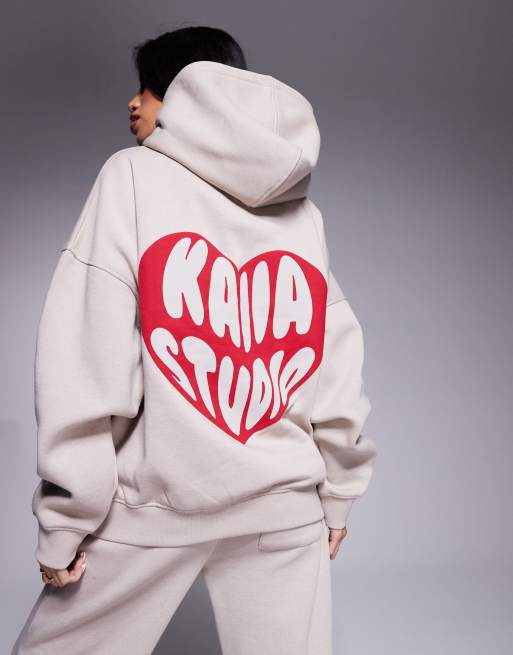 Kaiia cotton blend heart logo oversized hoodie in stone and red (part of a set)