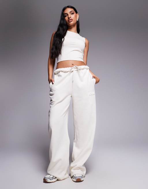 Kaiia cotton rich bubble embossed logo rolled waistband wide leg trackies in oat milk (part of a set)