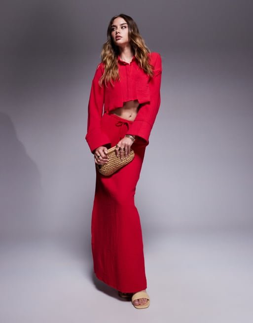 Kaiia linen blend cropped tie back oversized shirt and maxi skirt set in red