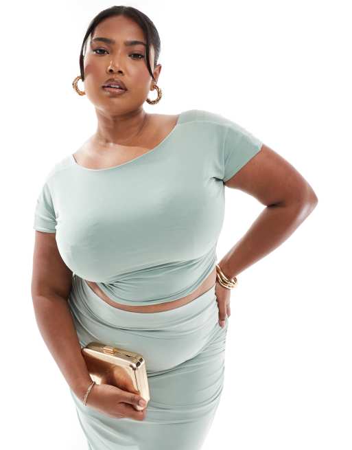 Kaiia Plus exclusive double-layered slinky wide neck top in sage (Part of a set)