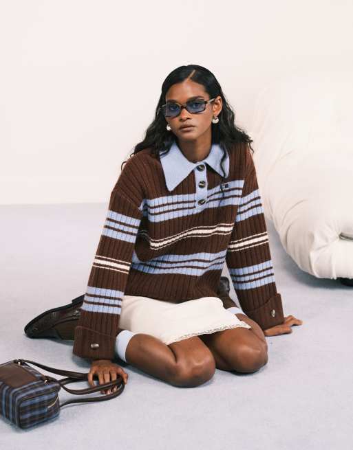 LAAGAM Graz knit polo in contrast blue and brown stripe