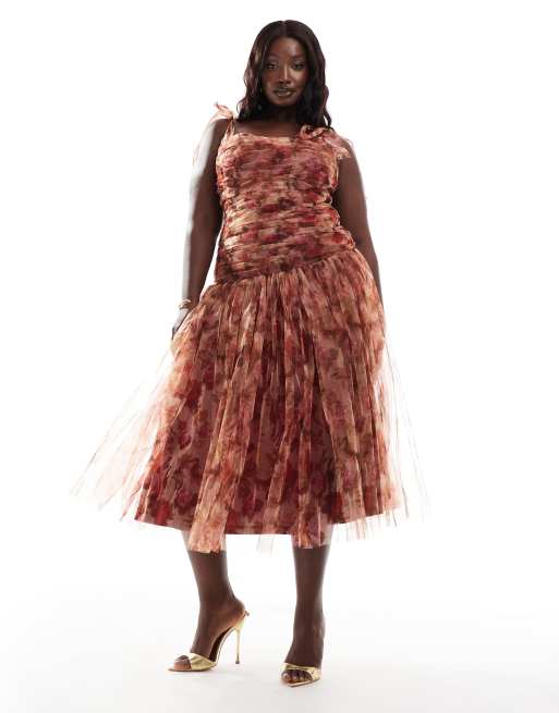 Lace & Beads Plus drop waist bow shoulder midaxi dress in rose print