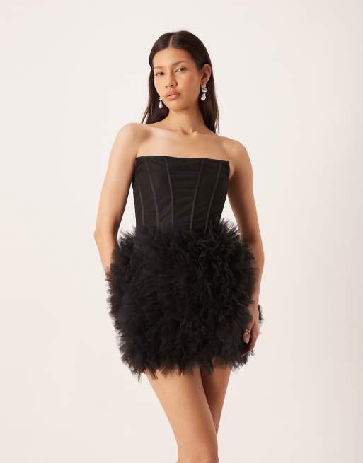 Lace & Beads bandeau corset detail tulle skirt mini dress in black