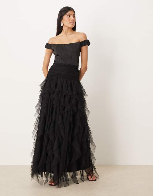 Lace & Beads bardot drop hem ruffle maxi dress in black