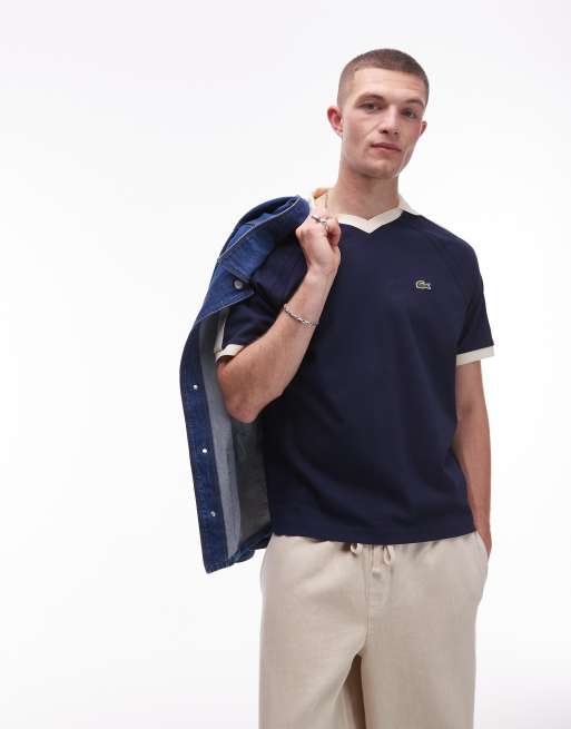 Lacoste polo shirt in navy blue with contrast collar and sleeve taping