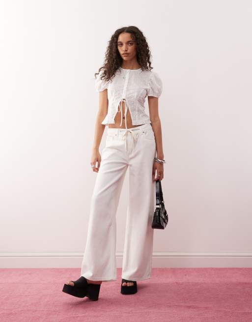 Lioness broderie puff sleeve button down tie detail cropped top and low rise jeans set in white