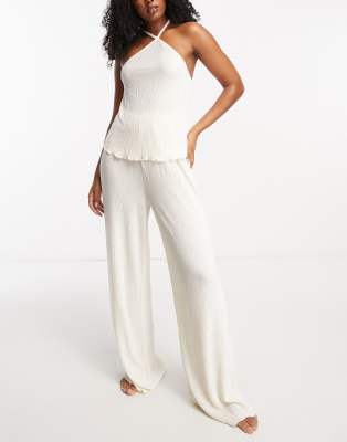 Loungeable crinkle velour halter and wide leg pants pyjama set in ivory
