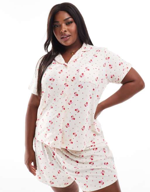 Loungeable Curve super soft jersey revere top and shorts pyjama set with piping detail in cherry and heart print