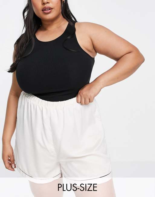 Loungeable Plus mix and match satin pyjama shorts in cream with black piping