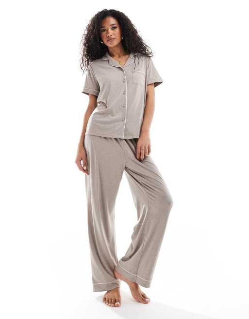 Loungeable soft rib jersey button short sleeve shirt and pants pyjamas in oatmeal marl
